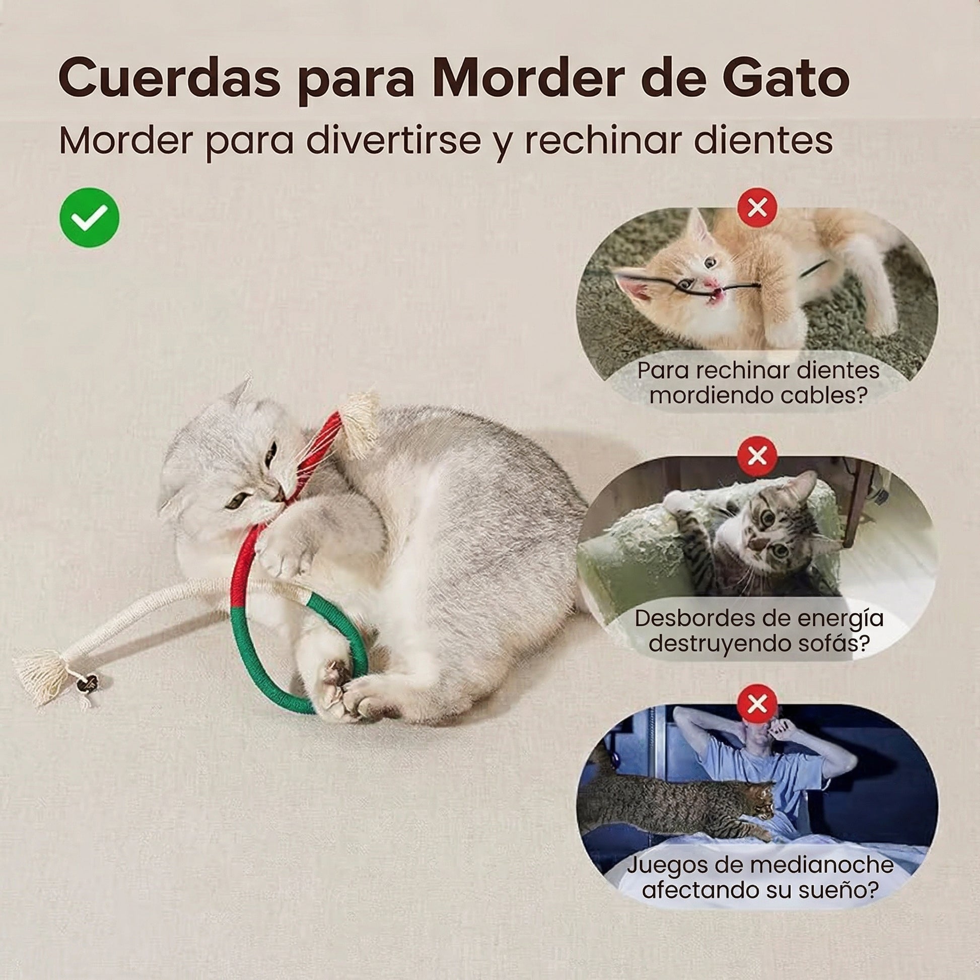 Su diseño recto facilita la mordida, ayudando a limpiar suavemente los dientes mientras el gato juega, reduciendo el estrés y evitando que muerda cables o muebles del hogar.